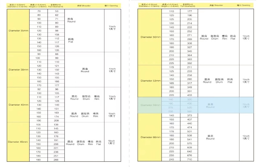 2、铝制罐尺寸:直径35mm、38mm、40mm、45mm、50mm、53mm、59mm、66mm,喷雾罐(铝罐高度可根据需求定制)