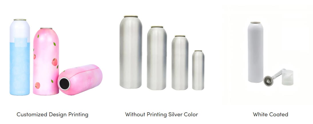 铝制喷雾罐适用于剃须泡沫、发胶、保湿喷雾、洁面慕斯、香水、防晒喷雾及丁烷气类产品。我们可提供直径35mm、40mm、45mm、50mm、53mm、59mm、66mm的铝罐,客户可根据自身产品选择最合适的规格。